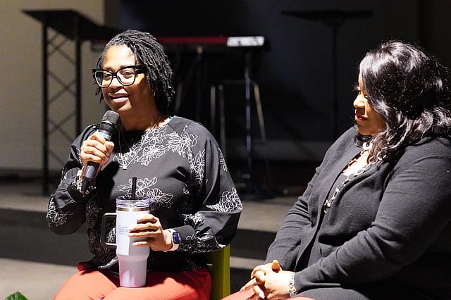 At a 100 Families Alliance Meeting in Little Rock, Reid expresses to County Coordinator LaShanna Bruce that she has often felt that the disconnect between organizations and healthcare providers makes it difficult for mothers in crisis to succeed. In order to provide comprehensive care for a family, several referrals, intake processes, phone calls, and applications have to take place at a time when parents are already so busy.